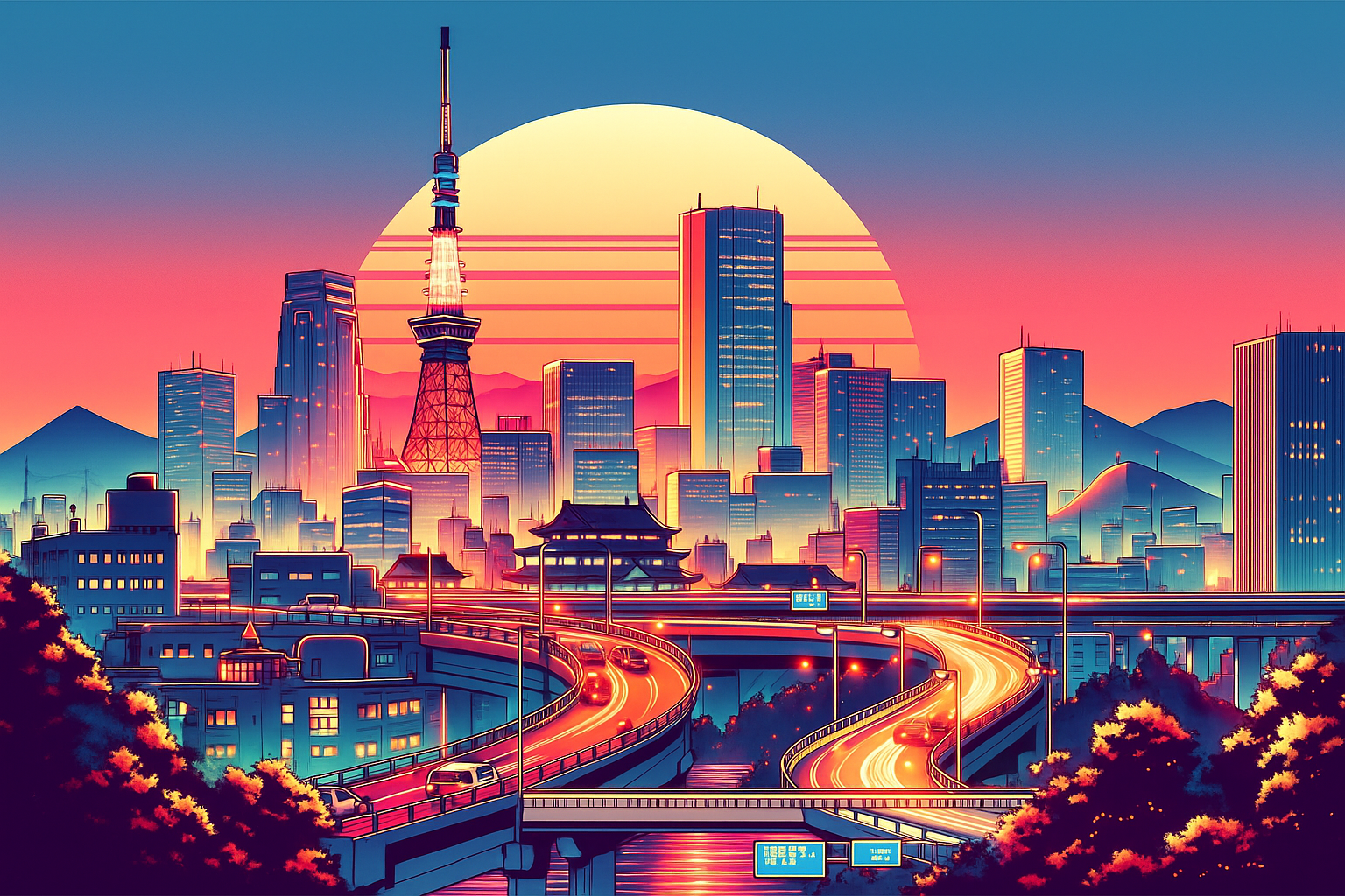 A joyful exploration of Tokyo's vibrant skyline during a summer evening.